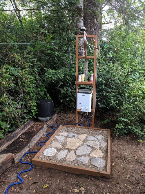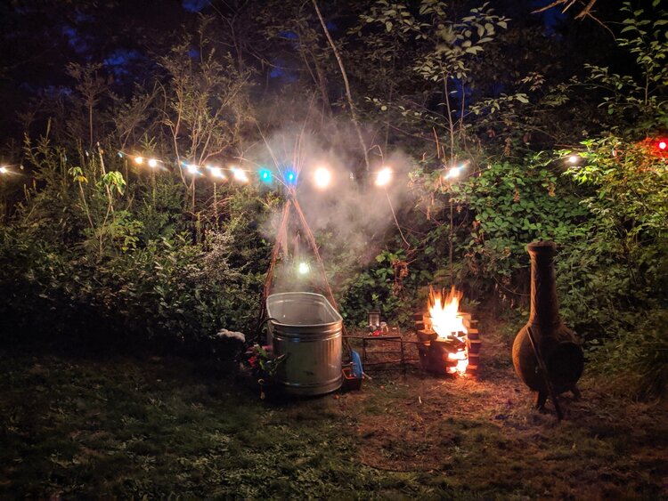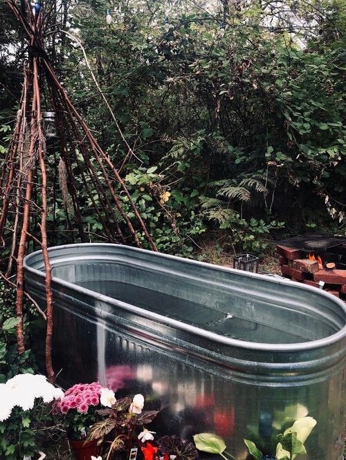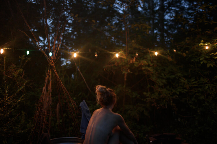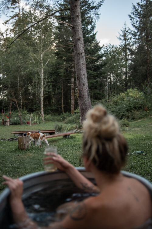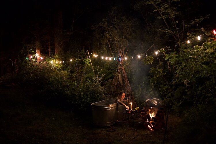 A propane-powered outdoor shower warmed us for endless hours and through all seasons. The steam often joined the rising morning fog and dew. It was my favorite thing to watch the world wake up, nude, warm, hidden. I felt as if I too was a creature of the woods. “Chop your own wood and it will warm you twice.” Well, we said “build a wood-fired hot tub, and it will warm you and some friends thrice”, (or at least through the wee hours of the morning).
